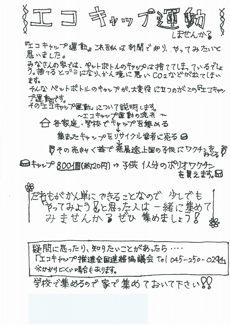 PR 今回も前回よりたくさんのエコキャップを集めていただきました。 (2008/1/16)のエコキャップ回収結果です。 〒334-0057 埼玉県川口市安行原1625番地 学校法人 東光学園 安行東光幼稚園 園長 根本 智可子(ねもと ちかこ)様 TEL 048-296-1225 エコキャップ 70.0kg (28,000個)