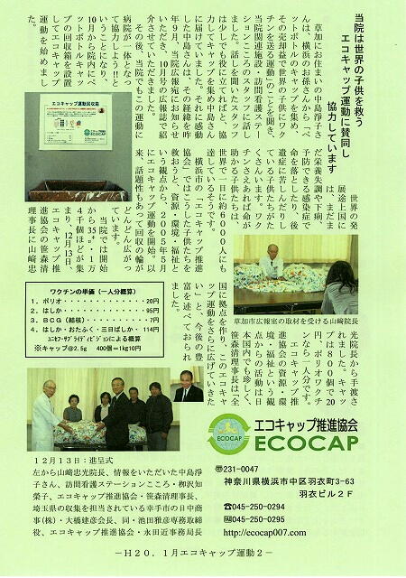 × [PR]上記の広告は3ヶ月以上新規記事投稿のないブログに表示されています。新しい記事を書く事で広告が消えます。 昨年チューは皆様に大変ご協力いただきまして、まことに有難うございました。 本年も昨年に増して皆様方のご協力を心よりお願い申し上げます。 今年は地域の集荷所の整備と定期回収の実現に向けて努力いて行きたいと思います。 埼玉県外のエコキャップ収集についても、関東圏をカバー出来ますように、随時回収車両を増やして行きたいと思います。 大量に集まったエコキャップの回収につきましては、従来どおり関東圏外でも対応させていただきます。 今年はエコキャップの回収箱を、早い時期に皆様に出来るだけ安く(出来れば無料が好ましいのですが)ご提供できますように、準備を進めたいと思います。 今年は1月7日(月)より活動を開始いたします。 PR 様より、12月13日にエコキャップを回収にうかがった際の様子 を掲載した病院広報誌を送っていただきました。 ありがとうございました。 草加市広報室の取材内容は東武よみうりウェブ版に掲載さ れています。 草加市の市立新里小学校(須山恵子校長)、埼玉草加病院 (山﨑忠光院長)などがエコキャップ運動を始めている記事 が掲載されています。 http://www.tobuyomiuri.co.jp/area/souka/eco.1.071126.html 写真の紙面を左クリックすると拡大表示されます。 続けてもう一度左クリックすると、さらに拡大表示されます。
